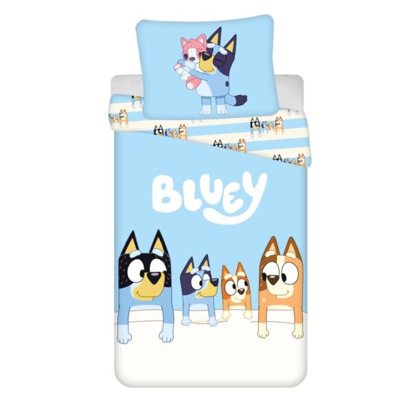 Pościel Bluey 004 baby to ciepła i radosna propozycja dla najmłodszych dzieci, inspirowana uwielbianą bajką Bluey. Przyjazna grafika z rodziną Bluey tworzy bezpieczny, pogodny klimat w pokoju dziecka i sprzyja spokojnemu zasypianiu.