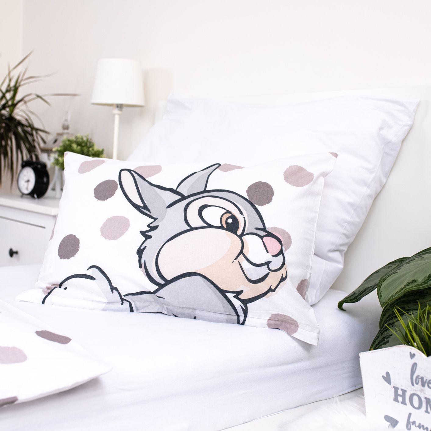 Pościel Bambi „Thumper Dots” baby to subtelna i urocza propozycja do pokoju najmłodszych dzieci, inspirowana bajką Bambi. Jasna kolorystyka w odcieniach bieli i szarości oraz motyw króliczka Tuptusia tworzą spokojny, przyjazny klimat sprzyjający wyciszeniu i snu.